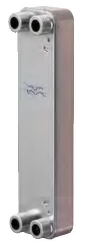 Теплообменник Alfa Laval CBH18AQ — паяный пластинчатый теплообменник, предназначен для работы в системах ОВиКВ. Отличается эффективностью теплопередачи и занимает мало места. Соединение пластин из нержавеющей стали методом пайки медным припоем позволяет обойтись без уплотнительных прокладок и толстых опорных плит. Припой надежно уплотняет и скрепляет пластины между собой в точках контакта, обеспечивая оптимальную эффективность теплообмена и стойкость к воздействию высоких давлений. Конструкция пластин обеспечивает максимально возможный срок службы. Варианты исполнения паяных пластинчатых теплообменников чрезвычайно разнообразны. В зависимости от нагрузки и заданных технических условий возможно использование различного рисунка и количества пластин. Возможно применение паяного пластинчатого теплообменника как в стандартном исполнении, так и специально разработанного с учетом индивидуальных потребностей. Стандартные области применения — системы отопления, вентиляции, охлаждения и кондиционирования воздуха, холодильные системы, промышленные установки нагрева и охлаждения, системы охлаждения масла. Принцип работы — поверхность теплообмена формируется из тонких гофрированных металлических пластин, последовательно установленных одна на другую. Между пластинами образуются каналы для протекания теплоносителей, а расположенные по углам порты организуют движение теплоносителей по соседним каналам по принципу противотока, обеспечивая наибольшую эффективность процесса теплообмена. Пакет пластин закрыт защитными крышками. Соединения расположены на передней или задней защитной крышке. Каналы образованы гофрированными пластинами, что способствует повышению эффективности процесса теплообмена. Данные, необходимые для подбора теплообменника: расходы жидкостей или тепловая нагрузка, температурная программа, физические свойства рабочих жидкостей, требуемое рабочее давление, допустимый перепад давления. Внешние панели из нерж. стали, соединения из нерж. стали, пластины из нерж. стали, припой медь. Стандартные размеры 73,5х315,5х8 + (2,16 * n) (+/-2 %) мм, масса = 0,4 + (0,07 * n) кг, где n — количество пластин. Мин. кол-во пластин 4. Макс. кол-во пластин 60.
